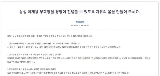 3일 청와대 국민청원에 따르면 지난 1일 '삼성 이재용 부회장을 경영에 전념할 수 있도록 자유의 몸을 만들어 주세요'라는 제목으로 게시글이 올라왔다.