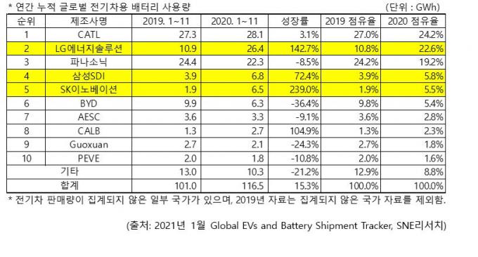 한국계 3사 모두 나란히 톱5에 들었다. 이들의 성과는 각 사의 배터리를 탑재하고 있는 모델들의 판매 증가에 따른 것이다. LG에너지솔루션은 주로 테슬라 모델3(중국산), 르노 조에, 폭스바겐 ID.3 등의 판매 호조로 지속적인 성장세를 보였다. 삼성SDI는 아우디 E-트론 EV, 포드 쿠가 PHEV, 폭스바겐 파사트 GTE 등의 판매 증가가 성장세로 이어졌다. SK이노베이션은 현대 코나 EV(유럽 물량)와 기아 니로 EV 등의 판매 급증에 힘입어 사용량이 급증했다.