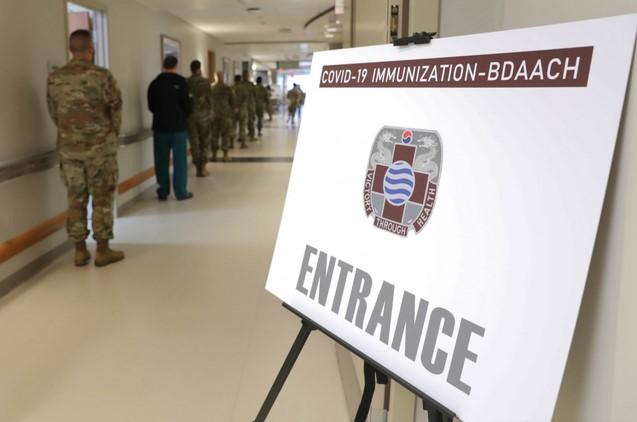▲지난달 29일 경기도 평택 주한미군 기지 내 브라이언 올굿 육군 병원에서 미군들이 코로나19 백신을 접종하기 위해 줄을 서고 있다. [주한미군 제공]