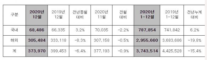 '코로나 직격탄' 현대·기아차 작년 판매 11.8% 줄며 역성장