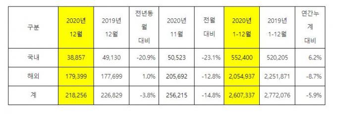 그나마 내수가 선방하며 버텼다. 기아차는 지난해 국내에서 2019년 대비 6.2% 증가한 55만2400대를 판매했다. 이는 기아차 창사 이래 최고 판매량이다. 현대차도 국내서 지난 2002년(79만4대) 이후 가장 많은 78만7854대를 팔았다. 현대차 역시 6.2% 증가했다.