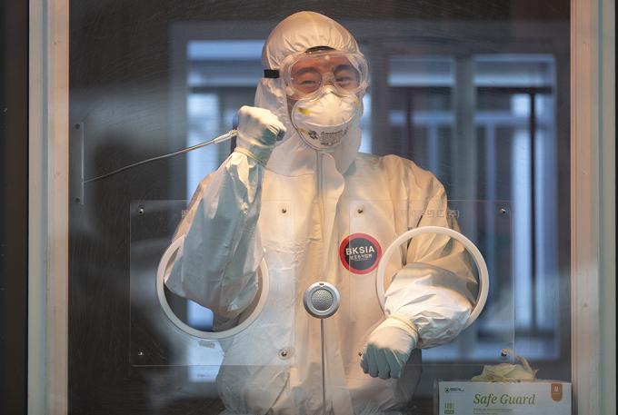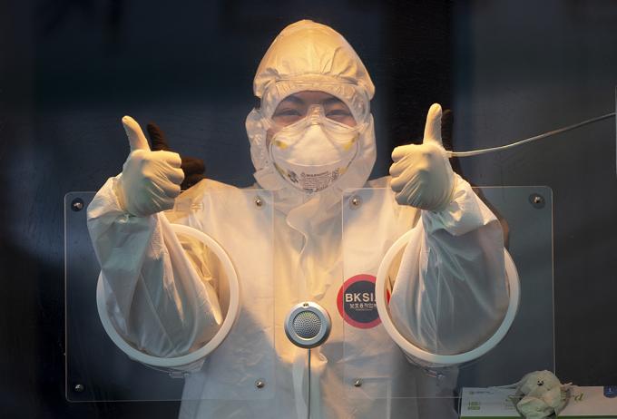 절기상 1년 중 가장 춥다는 소한인 5일 오전 서울역광장에 마련된 임시선별진료소에서 의료진이 잠시 휴식을 취하며 취재진에게 엄지를 들어 올리고 있다.