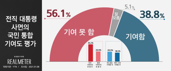 리얼미터가 YTN 의뢰로 지난 8일 전국 18세 이상 남녀 500명을 대상으로 '전직 대통령 사면의 국민 통합 기여도'를 조사한 결과, "기여 못 할 것"이라는 응답이 56.1%로 집계됐다.