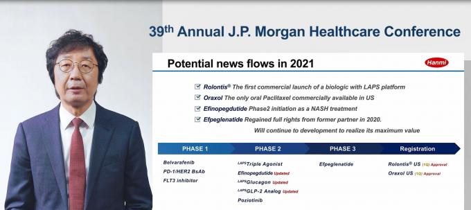 기술수출 롤론티스·오락솔, 연내 시판허가 기대 한미약품이 제39회 JP모건 헬스케어 콘퍼런스에서 코로나19 대응을 위한 글로벌 전략과 로드맵을 12일 공개했다.