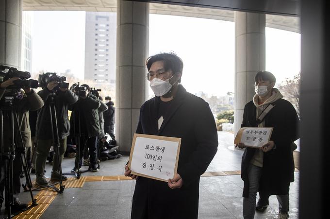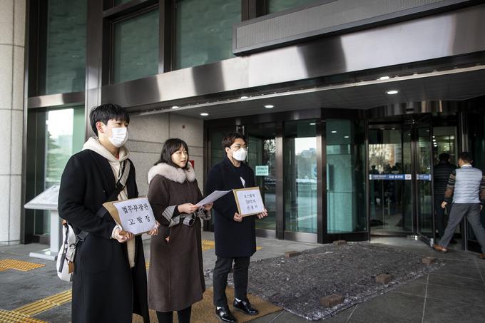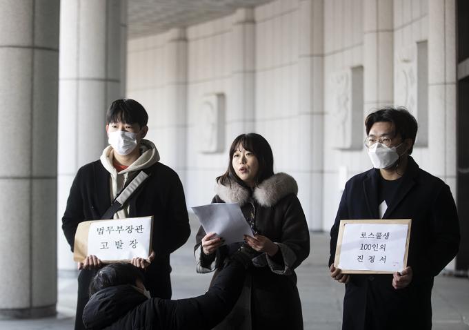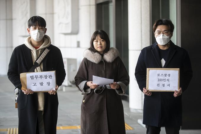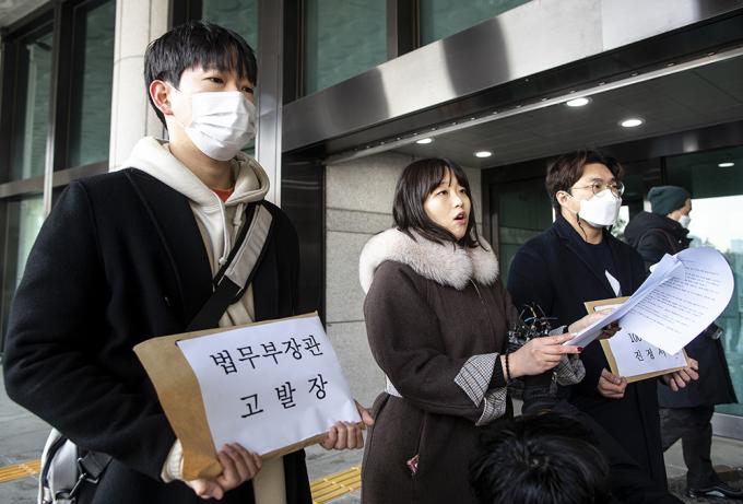 제10회 변호사시험 응시생들과 서울대 법학전문대학원생들이 12일 오전 서울 서초구 대검찰청 민원실 앞에서 추미애 장관과 법무부 법조인력과장에 대한 직무유기 혐의 고발장 제출 기자회견을 하고 있다. 이들은 제10회 변호사시험 도중 "시험관리감독관들이 1월 5~6일 이틀간 '법전 밑줄 허용 여부'에 대해 수험생들에게 각각 다르게 안내했고, 법무부는 7일에서야 수험생 모두에게 '법전 밑줄 가능'이라는 통일된 공지를 했다"며 "시험의 공정성과 형평성이 저해됐다"고 주장했다.