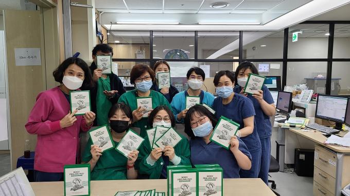 '엄마의목욕탕레시피 바디필링패드'는 저자극 각질 제거 바디 케어 제품이다. 일상에 복귀하지 못하는 의료진들의 개인위생 관리가 각별히 요구되는 상황에서 묵은 때와 각질을 한 번에 씻어내는 샤워 효과를 얻을 수 있을 것으로 기대된다. 천연 필링 성분으로 장시간 방호복 착용으로 민감해진 피부에 자극 없이 사용할 수 있다. 1회용 개별 포장이 돼 있어 위생적이며 보관도 용이하다.