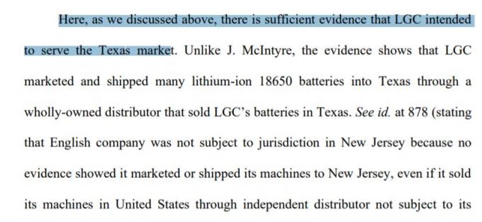▲ 지난해 12월 15일 텍사스주 법원 판결문. LG화학 측이 텍사스에서 배터리 상업 활동을 했다'는 원고측 주장을 받아들였다. [LG화학-토미 모건 소송 판결문 캡처]