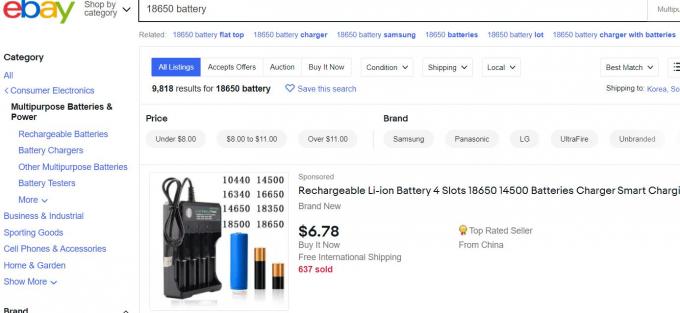 ▲ 온라인에서 판매중인 18650배터리의 모습 [이베이 웹사이트 캡처]