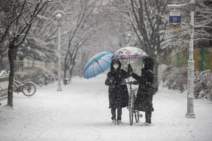 폭설이 내리고 있는 12일 오후 경기 부천시 상동에서 시민들이 우산을 쓴 채 발걸음을 옮기고 있다.