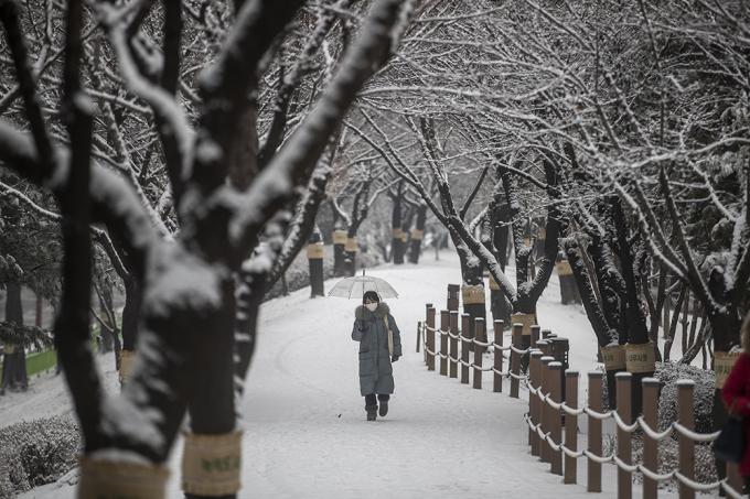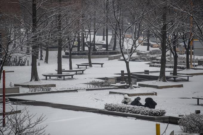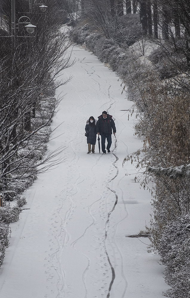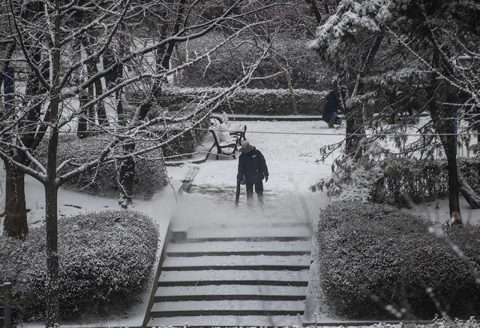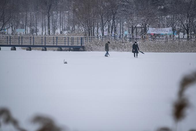 폭설이 내리고 있는 12일 오후 경기 부천시 상동호수공원에서 관계자가 제설작업을 하고 있다.