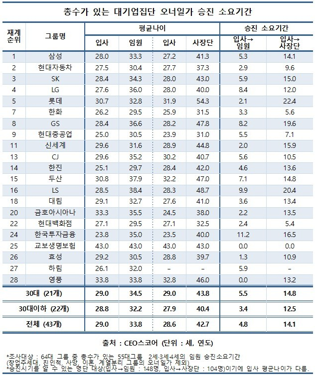 CEO스코어 64개 대기업집단 분석 결과 국내 대기업집단 오너 일가는 입사 5년이 채 되기 전에 임원으로 승진하고, 입사 후 사장단에 오르기까지는 평균 14년이 걸린다는 조사 결과가 나왔다.