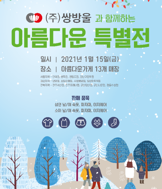 이번에 전달된 제품은 '쌍방울과 함께 하는 아름다운 특별전'을 통해 정상 소비자가의 20~40% 수준으로 할인된 가격에 판매된다. 성인과 소아 남녀 속옷 및 파자마, 이지웨어 등으로 구성되어 있어 온 가족이 함께 입을 수 있는 홈웨어 제품을 한자리에서 만나볼 수 있다.