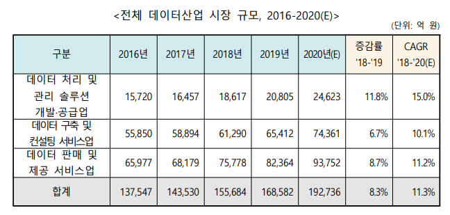 2016년 13조 원을 돌파한 데이터산업 시장 규모는 2019년까지 매년 1조 원 가량 증가했지만, 지난해에는 2조4154억 원 급증했다.