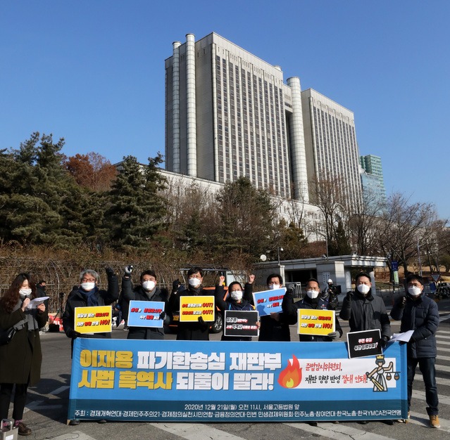 이어 "재판부가 '회복적 사법'을 재판 진행 중에 언급하면서 준법감시제도를 경영진들에게 유리한 '범행 후 정황'으로 반영할 수도 있음을 인정한 것 자체가 부당하다"며 "회사의 준법감시 노력이 경영진이나 총수에 대한 유리한 정상으로 참작될 수 있다는 발상 자체를 사법부는 부정해야 한다"고 덧붙였다.