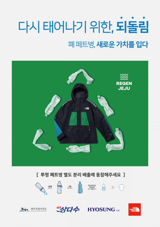 제주특별자치도와 제주삼다수는 제주에서 버려지는 국내산 페트병을 수거하고, 효성티앤씨는 국내 최초로 제주 폐페트병을 재활용한 '리젠 제주'를 공급하며, 노스페이스는 이 재활용 섬유로 의류와 가방 등 다양한 친환경 제품을 제작한다.