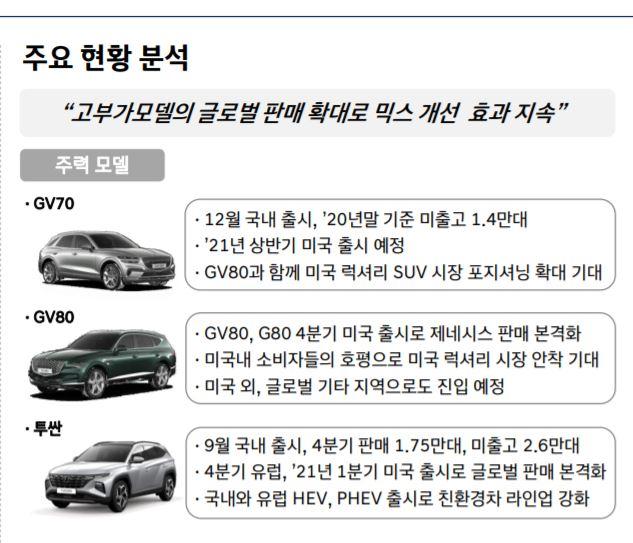 제네시스 GV80, G80 등 고급차 및 SUV 판매 비중 확대가 영업익 상승에 큰 역할을 했다는 것이 현대차 분석이다.