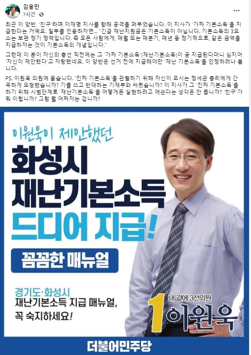 김 이사장은 26일 자신의 페이스북을 통해 이 의원의 지난 22일 올린 '친구 이재명 지사님께' 글과 관련, "최근 이 양반, '친구'라며 이 지사를 향해 공격을 퍼부었다. 이 지사가 '가짜 기본소득'을 지급한다는 것"이라며 "그런데 이 분이 자신의 총선 직전에는 그 '가짜 기본소득'(재난기본소득)이 곧 지급된다더니 심지어 '자신이 제안했다'고 자랑했다"고 비판했다.