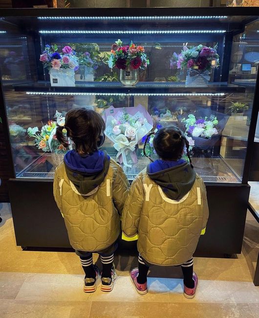 사진에는 남녀 쌍둥이가 머리를 맞댄 채 카메라를 바라보는 모습과 뒷모습이 담겼다. 쌍둥이답게 똑같은 옷을 입고 있어 귀여움을 더한다.