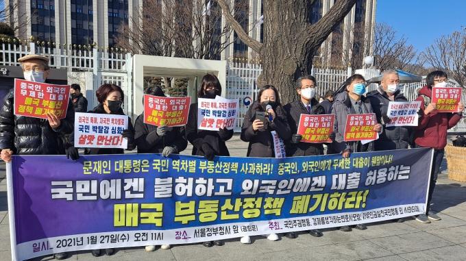 27일 오전 11시 서울 세종로 정부서울청사 앞에서는 국민주권행동, 경제를생각하는변호사모임, 자유인권실천국민행동 등 50여 단체가 연합해 '국민 옥죄고 외국인에겐 관대한 자국민 역차별 부동산정책 규탄' 기자회견을 열었다.