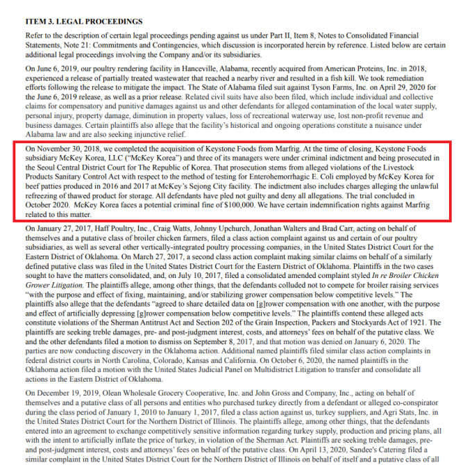 ▲ 타이슨 푸드의 회계연도 2020년 사업보고서. 맥키코리아의 모회사 타이슨 푸드가 한국의 햄버거병 관련 재판에서 벌금액을 10만 달러로 예상했다. 타이슨 푸드의 회계연도 2019년 사업보고서도 같은 내용을 포함하고 있다. [타이슨 푸드 홈페이지 캡처]