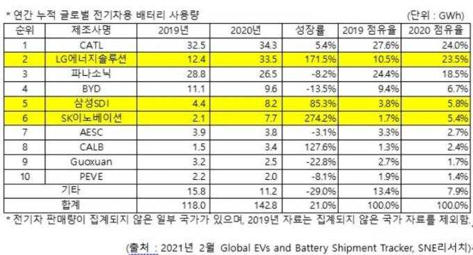 삼성SDI는 85.3% 증가한 8.2GWh(점유율 5.8%)로 전년과 같은 5위를 유지했다. 6위 SK이노베이션은 3.4배 이상 급증한 7.7GWh(점유율 5.4%)를 기록해 순위가 세 계단 올랐다.