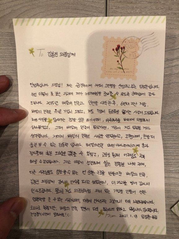 서울 광진구에서 카페 '고은별'을 운영하는 임성환 씨는 김봉진 우아한형제들 의장 앞으로 지난달 18일 이 같은 내용의 편지를 보냈다. 한 자 한 자 빼곡하게 눌러쓴 손편지였다.