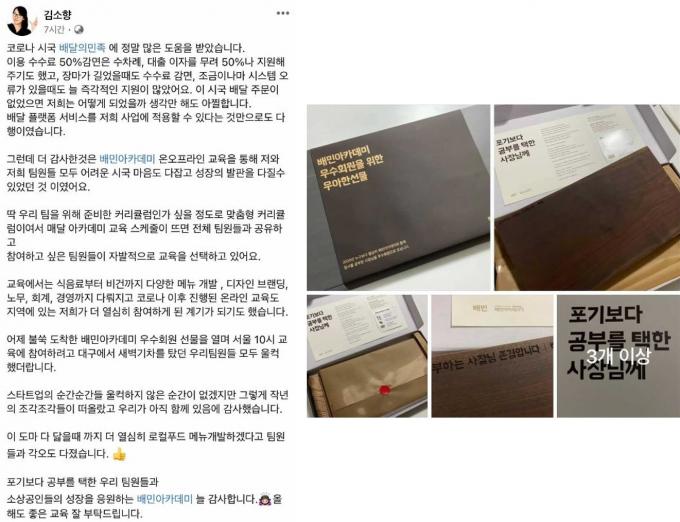대구에서 베이커리 카페 '마마플레이트'를 운영하는 김소향 씨는 개인 SNS에 배민아카데미에 대한 감사의 글을 올렸다. 김 씨는 "교육에서 식음료부터 비건까지 다양한 메뉴개발과 디자인 브랜딩, 노무, 회계, 경영까지 다뤄지는 데다 온라인 교육도 마련돼 지방에 있는 저희에게 큰 도움이 됐다"며 고 말했다.