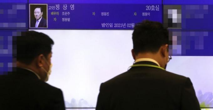 ▲ 지난달 31일 고(故) 정상영 KCC 명예회장의 빈소가 마련된 서울 송파구 서울아산병원 장례식장 로비 모니터에 고인의 빈소가 안내되고 있다. [뉴시스]