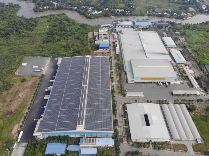 ▲ 메콩 델타(Mekong Delta)에 위치한 CJ제마뎁 냉동 물류센터. 2만5000㎡ 넓이의 지붕에 1만880개의 태양광 모듈을 설치했으며, 태양광으로 생산한 친환경 재생에너지를 활용해 연간 4840톤의 이산화탄소를 감축시킬 수 있을 것으로 예상된다. [CJ대한통운 제공]