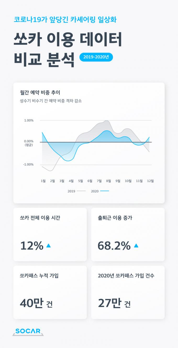 쏘카가 2019년과 2020년 쏘카 이용 데이터를 비교 분석해 코로나19 발생 이후 바뀐 카셰어링 이용 패턴에 대한 결과를 공개했다. 쏘카 카셰어링 이용시간은 1년 새 12% 이상 늘어났다. 이는 보다 안전한 이동수단을 선호하는 이용자들이 출퇴근, 쇼핑 등 일상생활에서도 카셰어링을 많이 활용했기 때문으로 분석된다.