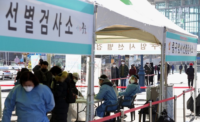 ▲ 지난 4일 서울역 광장에 설치된 중구 임시 선별검사소에서 시민들이 검사를 받기 위해 대기하고 있다. [뉴시스]