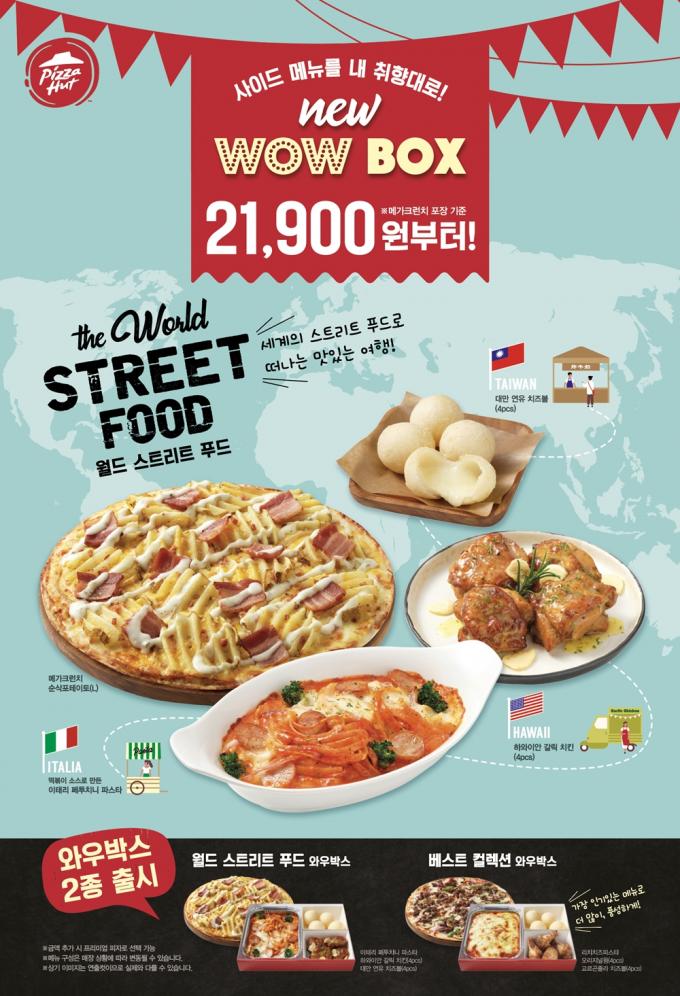 '월드 스트리트 푸드 와우박스'는 코로나 19 장기화로 인한 해외 여행에 대한 향수 및 음식에 대한 니즈를 반영, 해외의 인기 스트리트 푸드를 피자헛만의 방식으로 재해석했다. 피자와 하와이안 갈릭치킨, 이태리 페투치니 파스타, 대만 연유치즈볼로 구성됐다.