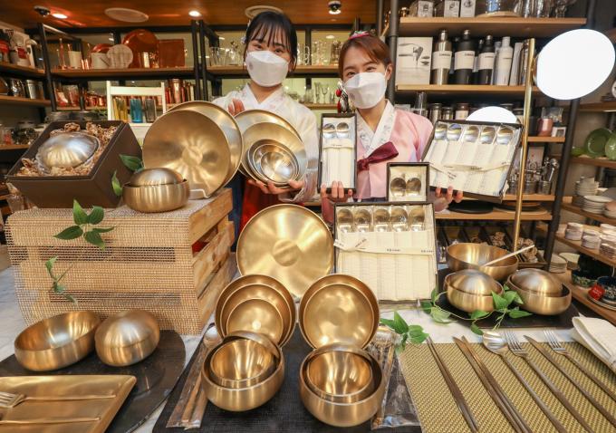 ▲ 현대백화점 압구정본점 윌리엄스 소노마 매장에서 10일 모델들이 놋담 유기그릇을 소개하고 있는 모습 [현대백화점그룹 제공]