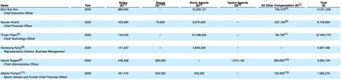 ▲ 쿠팡 경영진의 2020년 연간 보수 [미국 증권거래위원회(SEC) 상장 신고서 캡처]