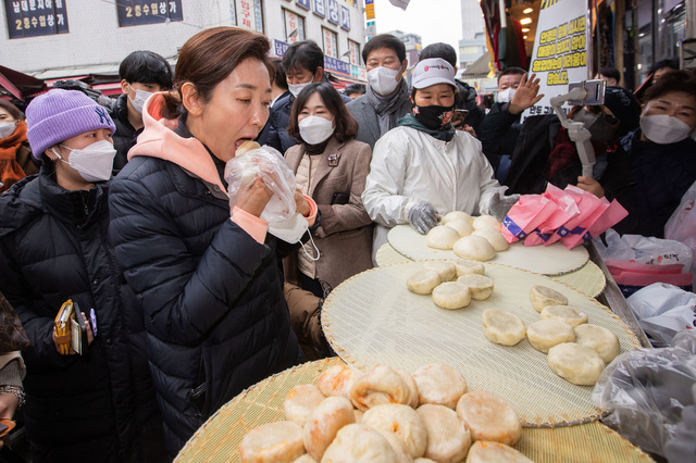 ▲ 국민의힘 나경원 서울시장 예비후보가 10일 서울 중구 남대문 시장을 방문해 만두를 맛보고 있다. [뉴시스]