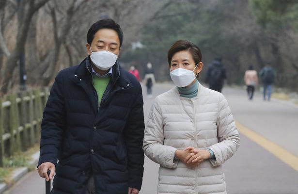 ▲ 국민의힘 나경원 서울시장 예비후보와 무소속 금태섭 후보가 14일 서울 남산 둘레길을 걸으며 야권 단일화등 현안에 대해 이야기를 나누고 있다. [뉴시스]