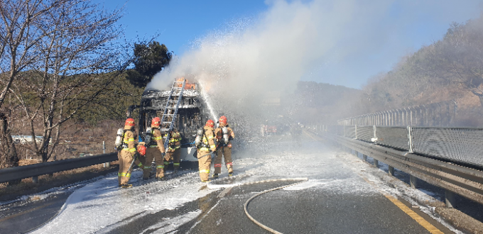 ▲ 지난 15일 창원에서 도로를 달리던 현대차의 전기 시내버스에 화재가 발생하자 소방대원들이 출동해 불을 끄고 있다. [창원소방본부 제공]