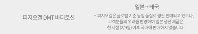 ▲ 피지오겔 DMT 바디로션의 제조국 변경 사항을 알리는 문구. [피지오겔 홈페이지 캡처]