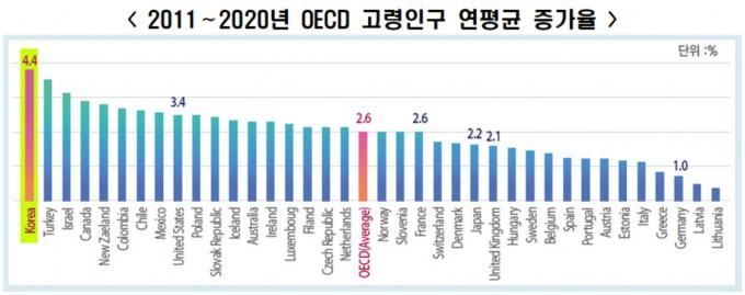 최근 10년간(2011~2020년) 한국의 65세 이상 고령인구는 연평균 4.4%, 매년 29만 명씩 증가했다. OECD 평균인 2.6%의 1.7배로 OECD 국가들 중 가장 빠른 속도다.