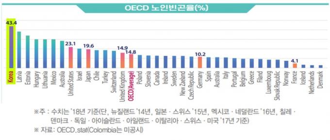 특히 2018년 기준 65세 이상 인구 중 가처분소득이 전체 인구의 중위소득 50% 미만인 자의 비율인 노인빈곤율은 43.4%로 집계됐다. 이는 OECD 평균(14.8%)의 3배에 이르는 가장 높은 수준이다.