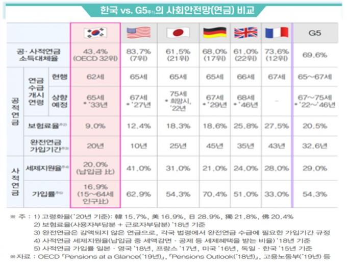 한국도 개시연령을 62세에서 65세로 상향조정할 예정이나, G5 국가들에 비해서는 여전히 낮은 수준이다.