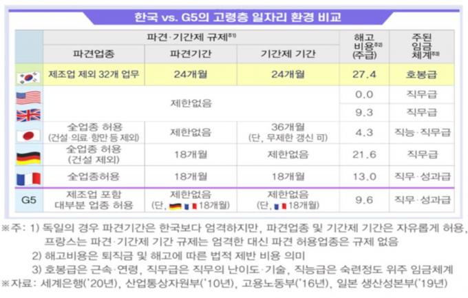 파견·기간제 사용의 경우 G5 국가들은 제조업을 포함한 대부분 업종에 파견을 허용하며, 파견·기간제 기간도 독일과 프랑스를 제외하면 나머지 미국, 영국, 일본은 무제한이었다. 독일은 파견 18개월 제한이 있으며 프랑스는 파견·기간제 18개월로 제한하고 있다. 반면 한국은 제조업을 제외한 일부 업종에 한해서만 파견이 가능하고 파견과 기간제 모두 2년 기간 제한을 두고 있다.