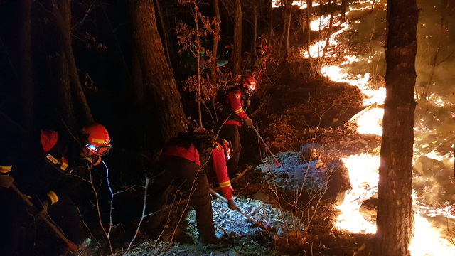 전날 불이 나자 산림당국은 헬기 11대를 비롯해 공중진화대와 특수진화대, 공무원, 소방대원, 경찰 등 212명과 진화차 등 장비 16대를 투입했다.