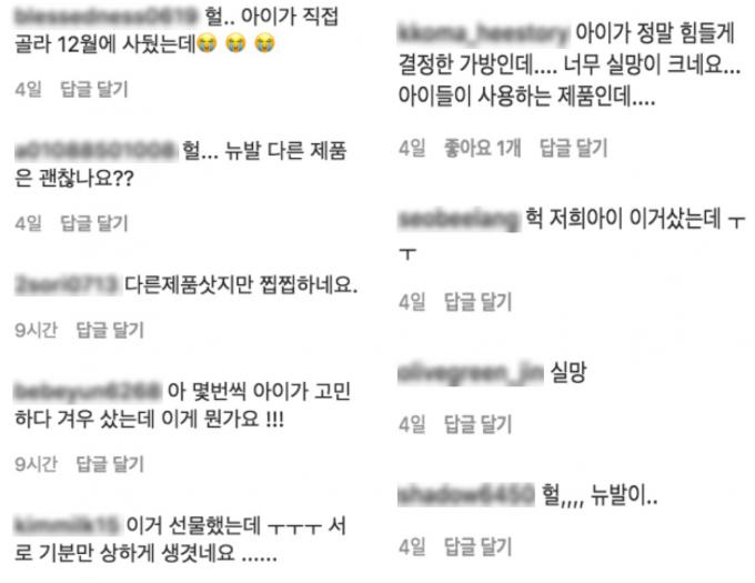 다른 소비자들도 "아이가 정말 힘들게 결정한 가방인데 너무 실망이 크다", "다른 제품은 괜찮은 것이냐", "다른 제품을 샀지만 찝찝하다" 등의 반응을 보였다.