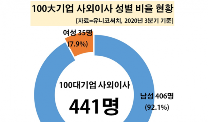 사외이사 숫자는 441명으로 집계됐다. 이중 여성은 35명(7.9%)에 그친 반면 남성은 406명(92.1%)로 압도적으로 많았다. 100대 기업 내 사외이사 여성은 열 명 중 한 명꼴도 되지 않은 실정이다.