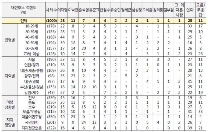 연령별로 이 지사는 20대(22%), 30대(28%), 40대(44%), 50대(39%)에서 높은 지지도를 보였다. 이 대표는 70세 이상(14%)에서, 윤 총장은 60대(20%)에서 가장 높았다.