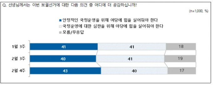 응답자의 43%는 '안정적인 국정운영을 위해 여당에 힘을 실어줘야 한다'는 국정안정론을 선택했고, 응답자의 40%는 '국정운영에 대한 심판을 위해 야당에 힘을 실어줘야 한다'는 정권심판론을 지지했다.