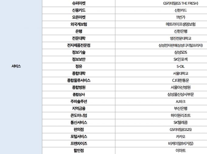 종합물류서비스는 CJ대한통운이 부문 1위를 기록했다. AI스마트 학습은 웅진씽크빅, 콘도미니엄은 하이원리조트가 1위로 선정됐다. 도시가스 부문에서는 삼천리, 사무기기 부문에서는 캐논이 1위에 올랐다.