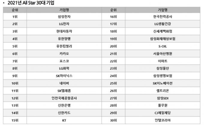이마트는 22위, 삼성물산은 23위를 기록했다. 25위 SK이노베이션과 26위 셀트리온은 올해 처음으로 올스타 기업에 선정됐다.