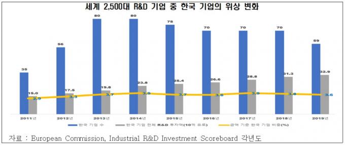 전 세계 R&D 금액에서 한국이 차지하는 비중도 2014년 3.9%에서 2019년 3.6%로 0.3%포인트 감소했다.